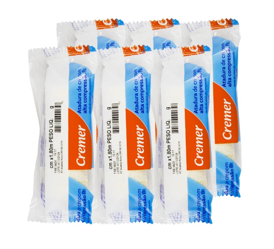 O que é Atadura de crepom com 6 rolos CREMER? A Atadura de crepom com 6 rolos CREMER é uma bandagem de alta qualidade, confeccionada em 100% algodão cru, com fios de alta torção que proporcionam excelente elasticidade no sentido longitudinal. Esse material é especialmente projetado para oferecer flexibilidade e resistência, permitindo o uso repetido sem perder suas propriedades, desde que lavada corretamente. A atadura combina compressão e elasticidade, proporcionando suporte eficaz e confortável para diversas finalidades terapêuticas.
