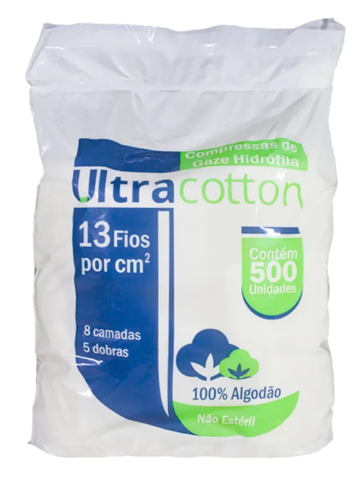 A Compressa de Gaze Hidrófila UltraCotton é produzida com 100% algodão, garantindo maciez, alta absorção e segurança durante os procedimentos. Possui 13 fios por cm², 8 camadas e 5 dobras, proporcionando excelente desempenho em curativos, assepsia e limpeza de ferimentos.