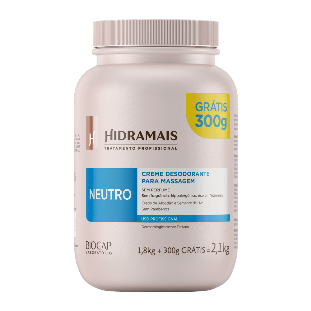 O CREME DESODORANTE NEUTRO PARA MASSAGEM HIDRAMAIS é um produto profissional desenvolvido para todos os tipos de massagem corporal. Sua fórmula neutra, sem fragrância e de alta qualidade, garante excelente deslizamento e hidratação, permitindo combinações com óleos essenciais ou ativos de tratamento conforme a necessidade do procedimento.