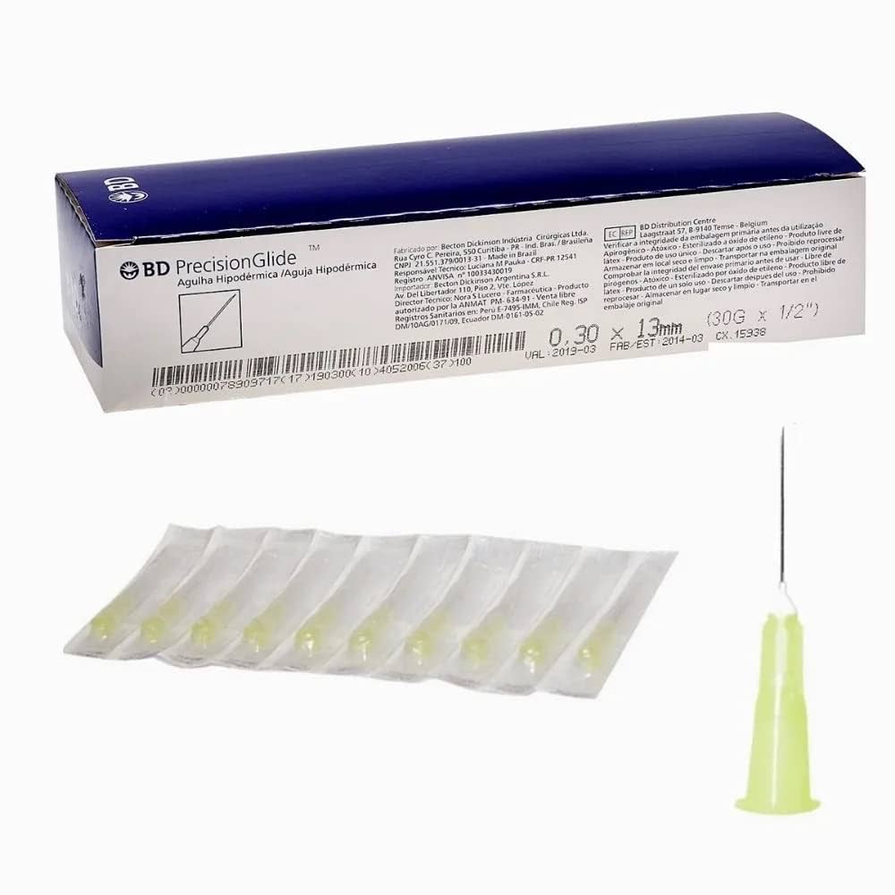 AGULHA HIPODÉRMICA DESCARTÁVEL 13MM X 0,30MM (½" x 30G) – CAIXA COM 100 UNIDADES – BD